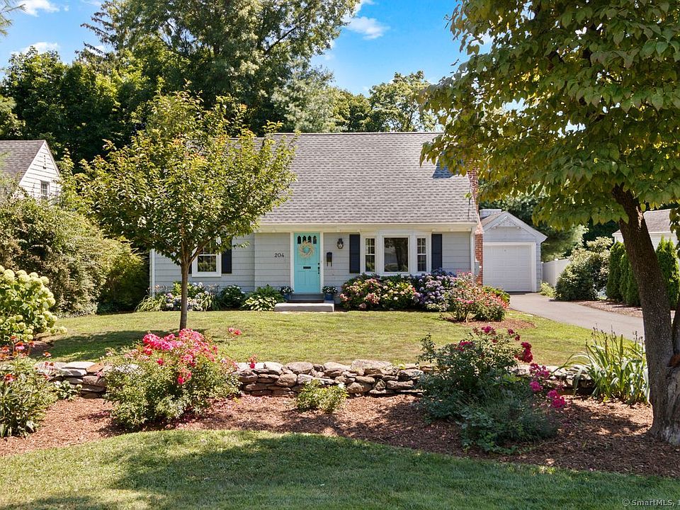 This charming Cape Cod-style home has such incredible curb appeal from the stone wall, to the beautiful landscaping with roses and hydrangea, to the cheerful turquoise front door! You can't help but smile when you pull into the driveway! Enjoy the open floor plan on the main level, where the stunning remodeled kitchen opens up to the living and dining spaces. A large bay window allows plentiful natural light into the living room, and the fireplace is a wonderful source of warmth in colder months. The kitchen sparkles with all white cabinetry, granite counters, stainless steel appliances, and a classic subway tile backsplash. The first of two bedrooms on the main level currently functions as a home office, and the larger second bedroom is currently utilized as a playroom and guest space. A remodeled full bath rounds out the main level. Upstairs you will find two additional spacious bedrooms, one with an ensuite remodeled bath serving as the primary bedroom space. A large basement provides plenty of storage, and could be finished off for additional living space in the future. The layout of this home provides so much flexibility! The back yard is deep and feels quite private, with mature trees and plantings. Plenty of space for entertaining friends and family, inside and out! A newer roof and mechanicals provide peace of mind, and a central location is convenient to local schools, West Hartford Center, Westfarms Mall, recreational facilities at Buena Vista, and the highway.