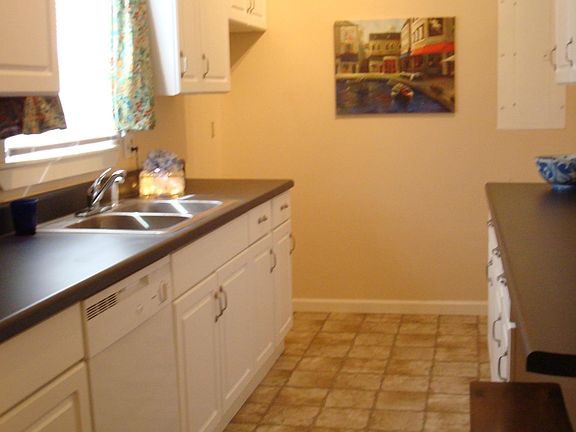 Galley kitchenSeparate laundry roomWoodgrain vinyl flooring