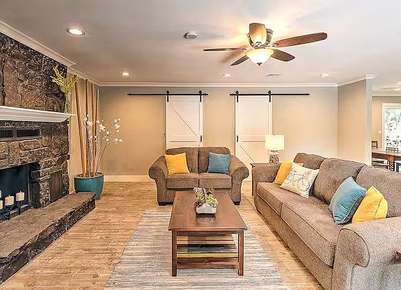 Just a short walk to the Bentonville Square, this one-level stunner combines thoughtful design with laid-back charm. The open layout is warm and welcoming, from the stone fireplace in the family room to the oversized island in the stylish, well-appointed kitchen. Sliding barn doors add flair while revealing a walk-in pantry and a full laundry room. Three spacious bedrooms with custom closets. Both bathrooms are beautifully remodeled with a spa-like design. But the real surprise? The backyard. Shaded, private, low-maintenance—with lush lawn, winding paths, mature trees, and a patio built for star-filled evenings and sunny brunches. There's a secure shed for bikes and gear. Refrigerator, W/D all stay. Furnishings are negotiable. This home is a Top 1% Airbnb Rental in the US. Whether purchased as a new family home or optimizing on a proven investment property, this is a rare blend of comfort, location, and single-level living in the heart of Bentonville.