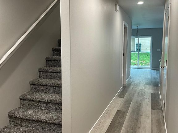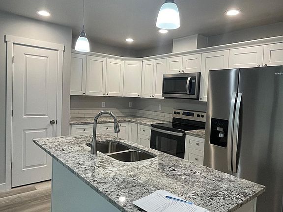 Over the range microwaveModern white shaker cabinetsCarpet in bedroomsLaminate flooringBeautiful kitchen with islandAll stainless steel appliancesGranite countertops