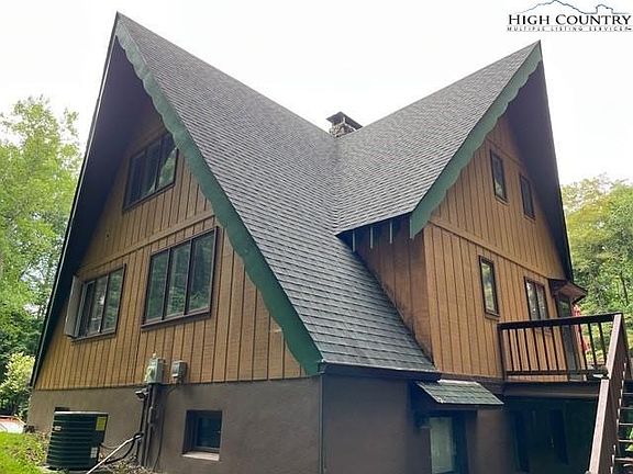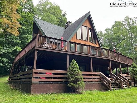 Great value on a wonderful A-frame home with cathedral ceilings and dramatic stone wood-burning fireplace on two levels with two separate kitchens. Lower level family or bonus room could be a 4th sleeping area. Large wrap-around decks, with lower deck completely covered. Large flat 1 acre yard with bordered by trees. Recently appraised at $407,000. Conveniently located to Hwy 421 and NC-TN border.