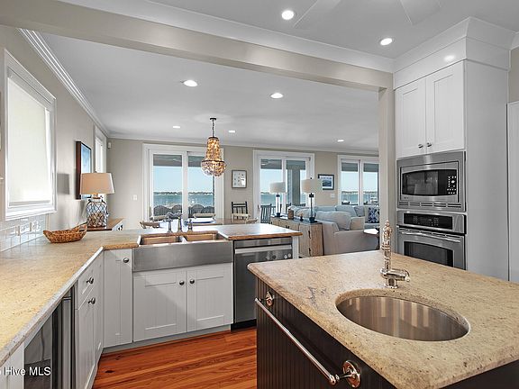 Welcome to 204 Shoreline Dr, a stunning waterfront retreat where every floor captures breathtaking views of Bogue Sound. Beautifully furnished and designed for life on the water, this home invites you to move in and spend your days boating, fishing, and unwinding on the spacious double porches overlooking the Sound. The first floor offers the perfect transition from outdoor living to indoor comfort with durable tile flooring, a den with built-ins and kitchenette, and a flex room. A full bath and laundry area open to the covered porch and outdoor shower—the perfect place to rinse off after a day on the boat before dropping towels and swimsuits in the laundry. An exterior cargo lift makes it effortless to move items to the second floor, where a wall of glass doors frames panoramic water views and opens to the covered porch. Light fills the open living area as hardwood floors flow into the bright, coastal kitchen with stainless steel appliances, a generous island, and a breakfast bar. Gather around the cozy fireplace or open the glass doors to let in the cool breeze and enjoy the water views from indoors or out. The first bedroom is ideal for guests with queen and twin beds and easy access to the hall bath, while three primary suite options offer flexibility. The first features an ensuite with a spacious vanity, while second offers a dual-vanity ensuite and porch access. Upstairs, the expansive third-floor suite is a private retreat with sweeping water views and an ensuite bath. A large private dock with two boat lifts, a fish cleaning station, and dock box makes it effortless to cast a line, launch your next adventure, or relax as the sunset reflects across the sound. The two-car garage with a workbench and full-size refrigerator provides plenty of space for gear. Combining the charm of coastal living with the convenience of a prime location near dining, shopping, beaches, and more, 204 Shoreline Dr offers the ideal setting to live your dream waterfront lifestyle.