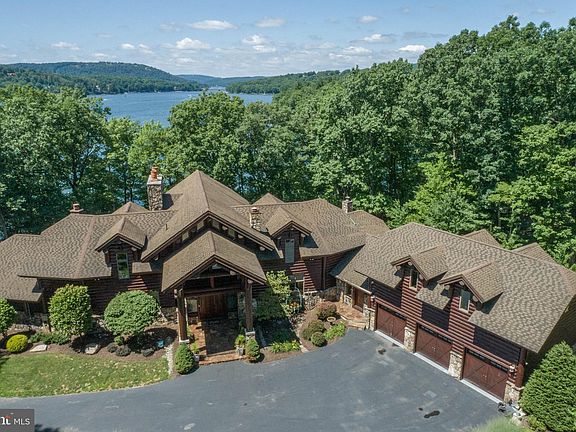 The epitome of a luxury lake home on Deep Creek, this Thousand Acres estate boasts a stunning log lodge set on a premier lakefront lot. No detail was omitted in the creation of this custom architectural masterpiece. From the moment you enter this residence, you will be transfixed by its breathtaking beauty and amazing use of elements of nature. There are soaring ceilings throughout, 4 massive stone fireplaces and sweeping staircases. A variety of wood types were used in this home, coming from a local barn as well as an Eastern Pennsylvania building that was razed in the early 20th century. The warmth of the home comes from radiant floor heat separated into many zones and complimented with propane forced air. The rustic kitchen features copper sinks, propane cooktop, Dacor double ovens, SubZero refrigerator, built in microwave, beverage refrigerator, Miele dishwasher and an ample island with wood and concrete counters. The dining area has a custom, hand built table perfectly suited for extended family gatherings. Discover a spacious main floor primary bedroom with incredible lake views, which leads to a unique primary bath, including walk-in tile shower, his/hers wood/metal/concrete sinks and an enormous walk in closet. All 5 bedrooms are generously sized and en-suite. Room above 3 car garage is currently configured as a home gym but could easily be converted to a 6th en-suite bedroom. Decks can be found in several spots from the 2 small decks off the loft where you can quietly enjoy a book while watching the beauty of nature. A private deck off the primary bedroom leads directly to the lakeside of the home. The enormous lakeside deck spans the width of the home and can be the perfect spot for entertaining! As you descend to the lower level, you will find a Civil War wagon wheel used as the focal point in the family room. Bar includes an ice maker, beer tap, dishwasher and beverage refrigerator. Sit by the oversized wood burning fireplace during the winter months and watch the snow fall. The perfectly manicured grounds, including koi pond built with native boulders and an abundance of flowers, plants and wildlife, are surrounded by an oversized concrete patio. This safe and serene setting is tucked away at the end of a 1000 acre peninsula with northwestern exposure and the finest sunsets on Deep Creek that can be witnessed from the deck, patio, yard or the custom built oversized dock. This home and property is an absolute must see!