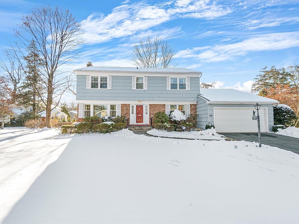 This classic Colonial home features a sunny foyer with a spacious closet and a large living room with overhead lighting and a wood-burning fireplace. The formal dining room opens to a large kitchen equipped with a gas range and plentiful counter space. The family room includes a skylight and sliding glass door that leads to a patio and flat yard. The second floor boasts hardwood floors under the carpets and features a king-size primary bedroom suite with a newly renovated ensuite bathroom and two walk-in closets. Three additional family bedrooms with ample closet space share a hall bathroom. The home also includes a two-car garage, a powder room, Anderson replacement windows, and a basement rec room with a separate laundry room and utility room. Additional features include a new gas hot water heater, hot air heat, central air, and a basement French drain with a sump pump.
