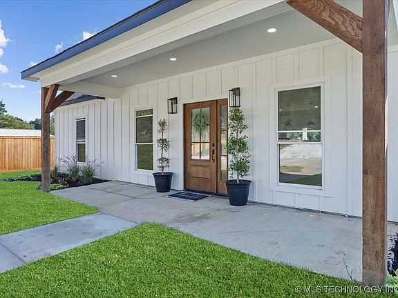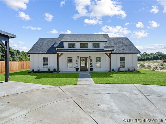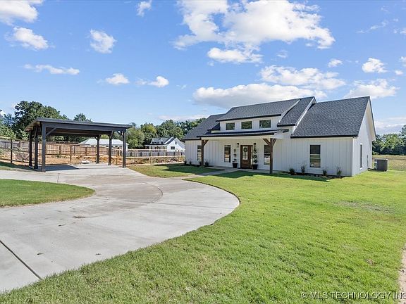 This perfectly symmetrical Modern Farmhouse plan speaks to the homeowner searching for a house plan that will provide a comfortable life with all the custom details a homeowner desires. Custom features include a dark roof, concrete driveway, landscaping, light oak engineered hardwood flooring, custom cabinetry and the exterior of this house plan displays a charming farmhouse design covered in traditional HardiePlank siding, a small front porch, and symmetrical windows filling the home with natural light. The welcoming front porch gives you plenty of space for a rocking chair to enjoy those warm summer nights. Eliminating the unsightly front sits a perfectly designed pergola for two vehicles. The larger rear porch offers enough space to feature a useful entertaining space for an outdoor kitchen and a comfortable area for outdoor furniture. With a door leading from the kitchen to the rear porch, this outdoor area is perfect for entertaining guests or having a family dinner outside. Walking through the front doors, you'll enter a great room with a large 14 foot ceilings. The comfortable great room has an open concept including the dining room and kitchen. This Modern Farmhouse kitchen offers a helpful center island that comfortably fits four chairs. There is also lots of counter space and cabinetry, and a custom window over the sink. This one-story Modern Farmhouse plan has a large owner's suite with an ensuite bath featuring double vanities and a separate shower and bath and a large walk-in closet. On the opposite side of this house plan are 2 more bedrooms. This split bedroom layout gives plenty of privacy to everyone. The two additional bedrooms have closets and a guest bathroom that is accessible to other visitors. With approximately 1590 square feet, this Modern Farmhouse plan was designed with 3 bedrooms, 2 bathrooms, and plenty of indoor and outdoor living space for everyone to enjoy.
