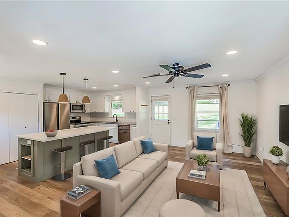 Just inside, you'll discover a beautifully updated interior with an open concept and split floor plan. The recently renovated kitchen boasts an oversized island, white cabinets, and stainless steel appliances. Additional recessed lighting has also been added throughout, enhancing the home's bright and welcoming atmosphere.