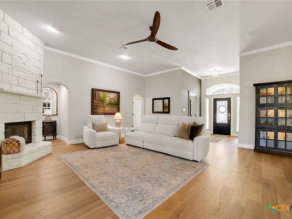 Elegance. Beauty. Style. High ceilings, warm wood floors, stone fireplace, stylish modern steel doors, classic recessed lights and crown molding.