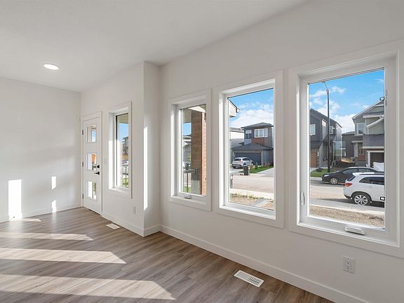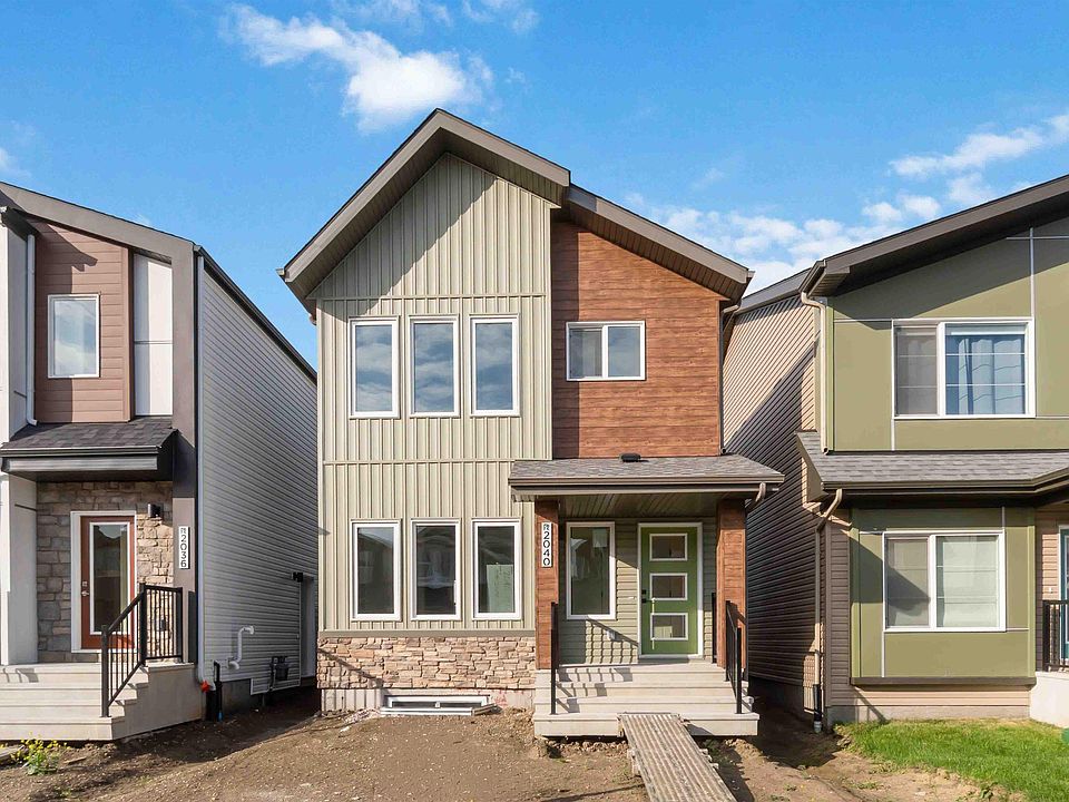 Experience the elegance and craftsmanship of The Sylvan. Luxury Vinyl Plank floors flow through the main level, starting with a spacious foyer and walk-in coat closet. A bright great room leads to a functional kitchen with quartz countertops, a flush island, Silgranite sink, soft-close Thermofoil cabinets, and an over-the-range microwave. Around the staircase, you’ll find a generous pantry. At the rear, enjoy a sunlit nook overlooking the backyard, a main floor bedroom, full 3-piece bath, and access to the yard via a garden door. A parking pad is included, with the option to add a detached two-car garage. Upstairs offers a light-filled primary suite with walk-in closet and 3-piece ensuite, plus two more bedrooms, another full bath, and a laundry closet. The Sylvan also features black plumbing and lighting fixtures, 9' ceilings on the main and basement levels, a separate side entrance, and rough-in basement plumbing.