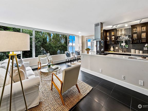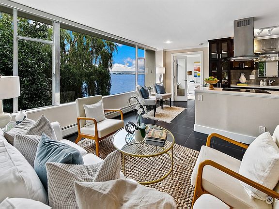 Lakeside West ~ built just in time for the Seattle World’s Fair! Embrace life on the water from this sophisticated 2-bedroom corner unit in tony Madison Park. Generous natural light, views of Lake Washington and Cascade Mountains create the perfect ambiance year round. The circular floor plan allows for ease of living and flexibility of how to best use the spaces. A heritage Willow tree provides privacy and filtered light from the great room and private balcony. Primary bedroom with walk-in-closet, laundry room and updated ¾ bath looks out to a park and green lawn. This desirable location includes 1 secured parking spot, water access for kayaks, and is close to Madison Park’s best shops and restaurants. An absolute must-see!