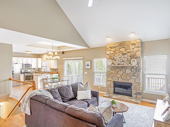 Beautiful updated 3 bedroom ranch located in Valley Creek in Elgin~ nothing to do but move in. Inviting foyer opens to a spacious living room with vaulted ceilings and a stone fireplace. The recently updated kitchen has modern white cabinetry, newer stainless steel appliances (2018), breakfast bar, and dining area with tray ceiling. The master bedroom features; a tray ceiling, slider to the deck, and recently renovated en-suite bath with new flooring, faucets, showerhead, toilet, and freshly painted vanity. There are two additional bedrooms with ample closet space, and a updated hall bath. The finished basement includes; a large family room/rec room, a full bath with marble cast shower and granite countertop, and a laundry room with cabinets for storage and a laundry sink. The current upstairs mudroom still has the hookup for laundry if you want first floor laundry. There is plumbing and electrical set up for a future bar in the basement. Relax on the deck overlooking the outdoor space. The deck has a natural gas line run to it for a grill. Great location near parks, restaurants, shopping, and minutes from Randall Road. Won't last long!