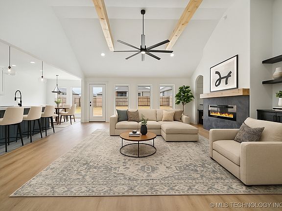 Step into elegance with this stunning 3-bedroom full-brick home, thoughtfully designed with soaring ceilings, an open layout, and high-end finishes throughout. The chef’s kitchen is a showstopper, featuring premium appliances, quartz countertops, soft-close cabinetry, custom tilework, and an oversized walk-in pantry. Your primary retreat offers the perfect balance of luxury and function, complete with a floating soaking tub, dual vanities, custom-tiled shower, and an expansive walk-in closet with direct access to the oversized laundry room and built-in mudroom cubbies. Each bedroom includes its own walk-in closet, while outdoor living is a breeze with both a covered front porch and a spacious covered back patio. Neighborhood amenities include POOL, Playground, & Pickleball court coming soon. Bixby West Schools. Schedule your private showing today!