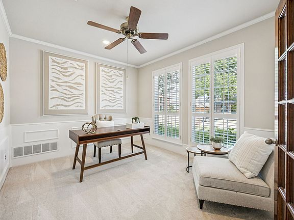Upon entry, you’re greeted by a private study—ideal for working from home or quiet focus time—alongside a formal dining room and formal living room that can flex to fit your needs. At the heart of the home, the kitchen, breakfast area, and expansive living room with soaring ceilings flow together seamlessly. The kitchen features a center island, breakfast bar, painted cabinets, and a charming corner window seat in the dining nook, creating a natural gathering space.