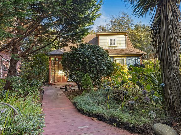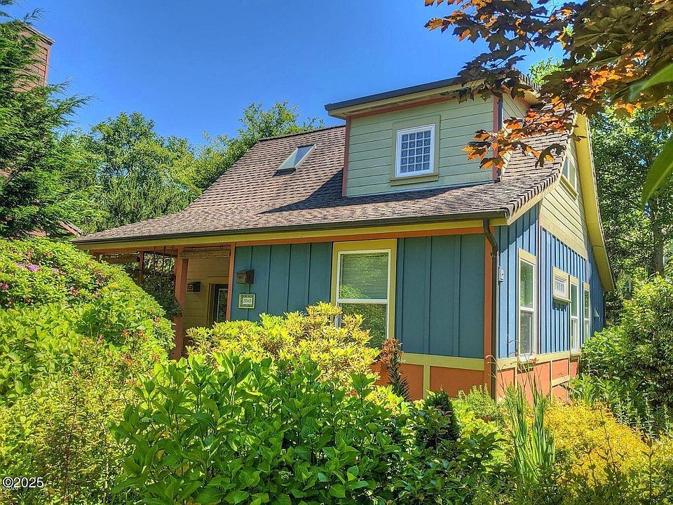 Coastal craftsman cottage nestled in the charming Overleaf Village with a short stroll to the beach. This 2-bed, 3-bath home welcomes you with abundant natural light, vaulted ceilings, and a striking rock fireplace with pellet stove insert. An additional room offers flexible space perfect for a home office or cozy den. The spacious kitchen features ample cabinetry and counter space flowing into a generous dining area. A finished bonus room above the detached garage includes its own full bath (HOA restricts use as living space or bedroom). Serene landscaping surrounds the property with a peaceful creek bordering the backyard. Follow the creekside path to discover the 804 hiking trail, dramatic ocean waves, and breathtaking coastal sunsets.