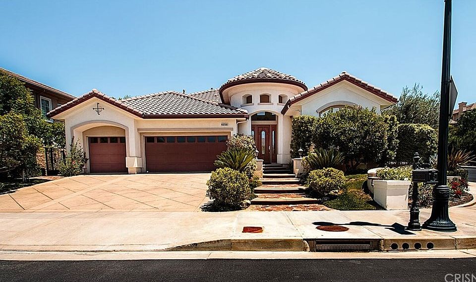 BOM. Located in one of Porter Ranch's most prestigious gated communities, "The Renaissance" , is this stunning single story Mediterranean home. This residence boasts over 2900K sq ft of living space, and features central air & heat, guest bedroom with full bathroom, dedicated laundry room, great room, and attached 3-car garage. The living room offers a modern open floorplan design with built-in alcoves, recessed lighting, stone floors, and elegant lighting fixtures. The great room is the ideal center space for family living, with an open kitchen concept and built-in media center an fireplace in the family room. The kitchen features built-in appliances, breakfast bar, dining area, ample shelving and storage options, and warm natural light and rear yard views. The secondary bedrooms feature plush new carpeting, mirrored sliding wall closets, and generous floor space. The master suite will be your delight and sanctuary, with ample floor space, you can easily create a reading nook or soak in the large tub in the master bathroom after a long day. The rear yard features dual patios. lush manicured lawns, and mature trees, and built-in BBQ.