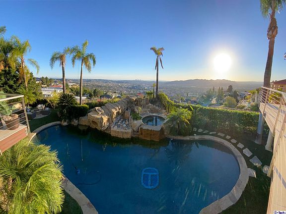 Looking to experience the height of luxury living in a stunning Glendale home with spectacular views? A grand tiled foyer welcomes you into this remarkable residence where style and elegance are displayed alongside the finest in contemporary comfort. High ceilings soar above the sunken living room as expansive picture windows usher in radiant light and capture the sweeping panorama of downtown Glendale and the Los Angeles skyline. Opulent chandeliers adorn the ceilings, including the gorgeous kitchen where the home chef will be equipped with top-of-the-line stainless steel appliances, loads of storage, and an island with seating. Treat guests to gourmet meals in your formal dining room with mirrored tray ceilings and access to the patio. Step outside and gather around the fire pit to enjoy an after-dinner cocktail and watch the sun sink on the horizon. All of the bedrooms and baths are absolutely stunning, plus your generously sized personal retreat features floor-to-ceiling windows that take advantage of the incredible vistas, a free-standing garden-style tub, a glass-enclosed rainfall shower, a twin sink vanity, and a deep walk-in closet. Crafted for the avid entertainer, the lower level offers an abundance of space for hosting company. You'll have a second kitchen, and a wall of doors opens to reveal your beautifully landscaped and private backyard with its sparkling free-form pool/spa, multiple seating areas, and spectacular views. Other desirable features of this remar