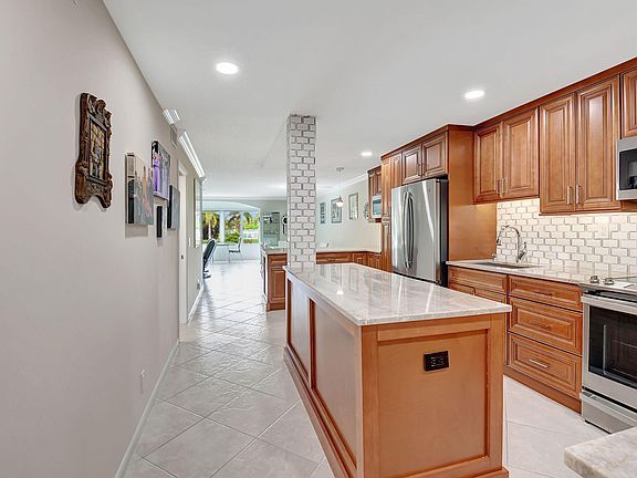 EXECUTIVE DISCOVERY! BEHOLD THE GRANDEST CV CONDO! Enter your exquisitely renovated 3-year-old Century Village Boca residence! Marvel at the natural beauty outside the Lanai, and soak in the serenity through hurricane-proof windows. Enjoy the unobstructed transition from the living room to the lanai, where sliding doors were removed. Stunning open kitchen, boasting of beautiful custom wood cabinets and stylish subway tile backsplash with stainless-steel appliances. It features two microwaves, two sinks, a sizable refrigerator, and an extra full fridge in the lanai's built-in unit. The cabinets are meticulously organized, and quartzite countertops contribute to the attractive clean look. The kitchen extends into the entrance hall and dining area. And has a view to the outdoors! The condo has fresh look with paint in a neutral tone complemented by light flooring. Bedrooms feature engineered wood floors. The spacious dining room can comfortably fit a full-sized dining table. The condo has two beautifully renovated bathrooms, with stunning tile walls. The lanai offers panoramic water views visible from most rooms, ensuring abundant natural light. The A.C. unit was replaced three years ago, a new electrical panel.