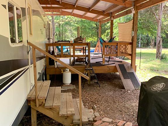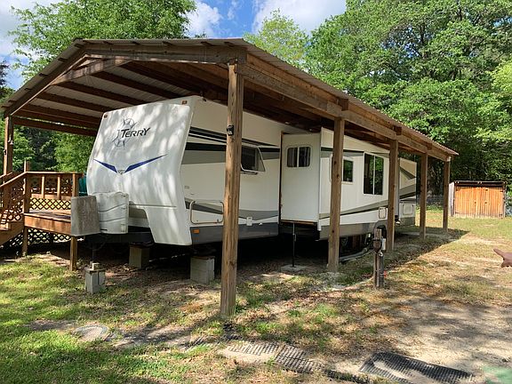 The travel trailer comes with a permanent 20x40 covering, providing shade and protection from the elements. Adjacent to the trailer is a spacious deck, perfect for outdoor dining, relaxation, and soaking in the picturesque views of the surrounding nature. Additionally, there is another RV covering on the property, ideal for hosting guests or expanding your living space.