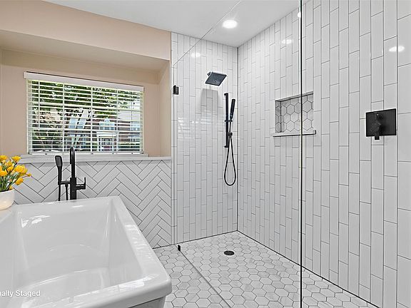 Sparkling saltwater poolModern light fixturesPrivate backyard oasisNew mirrorsLuxury wood laminate flooringQuartz countertopsOversized frameless walk-in shower