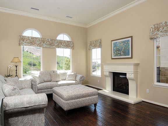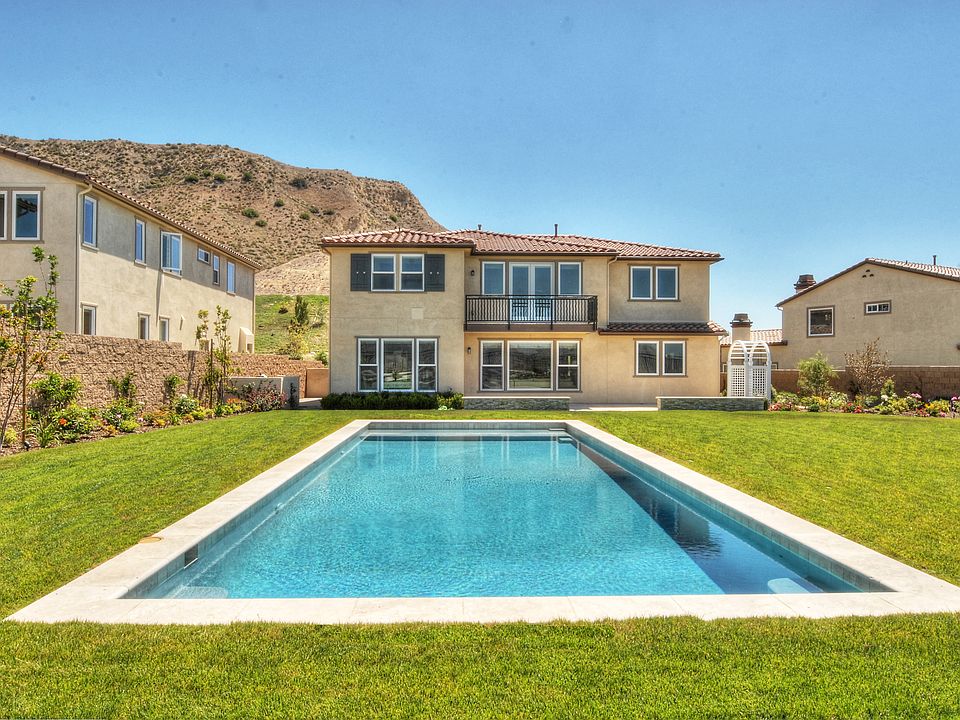 Situated on one of the best lots in Renaissance, an exclusive guard-gated community in Porter Ranch, this 2013-built 3813 sq. foot home on over a half acre lot at the end of a cul de sac, looks out onto a sprawling backyard surrounded by panoramic mountain and valley views. This highly upgraded home features an English garden landscape with a lap pool, travertine coping and patio, 4 bedrooms (with an option to convert to a 5th bedroom), 4.5 baths, a spacious bonus room, crown molding and hardwood flooring throughout, upstairs laundry room, and a 3-car garage. The foyer opens to a crystal chandelier surrounded by a spiral staircase, a formal living room with a fireplace, a formal dining room, and a large family room and gourmet kitchen overlooking the scenic park-like landscape. The family room is equipped with built-in 5-speaker surround sound and is electrically wired for a wall-mount flat panel TV. The kitchen offers a center island with granite counters, customized backsplash and trim, stainless steel appliances, five-burner cook-top, double oven, microwave, trash compactor, a 42?refrigerator, and a breakfast nook. The master suite offers a luxurious master bath with marble shower, floors, sink and bath counter tops, and a spacious walk-in closet.