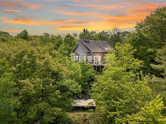 Private frontageOpen-concept kitchenGrand stone fireplaceLoft-level primary suiteExpansive waterside deck