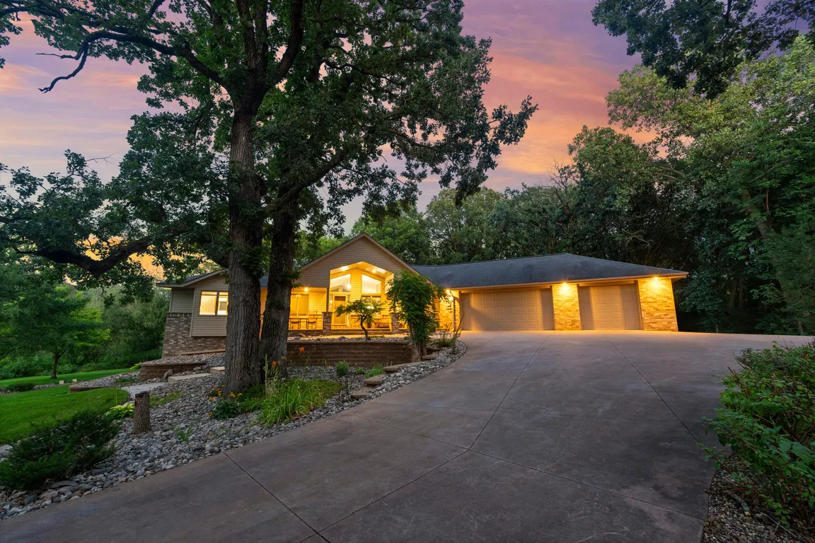 Custom walkout rambler on a private 5+ acre retreat with incredible garage space! Tucked away on 5 wooded acres with wetland views, this stunning custom walkout rambler offers privacy, luxury, and unparalleled garage space. A long concrete driveway with extra parking leads to a beautifully landscaped property. The exterior features stamped ...