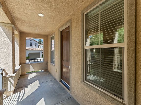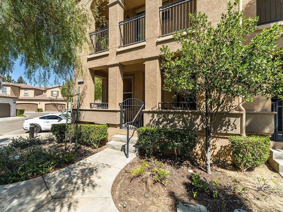 In a gated community of Porter Ranch, with beautifully built homes, sits a 1669 sqft, 3-bedroom, 3.5-bathroom condominium, and ready for the next lucky buyer to make their mark. A walkway leads to the front door of this corner unit that is conveniently located under a covered patio, perfect to set up for lounging and enjoy some shade from the hot summer days of the valley. Upon entering you are greeted with an open floor plan that has tile flooring all throughout the home and is flooded with natural lighting. An easy flow to the fully equipped kitchen, which features built-in stainless-steel appliances, taupe granite countertops and walnut toned cabinetry, makes the whole space the perfect dynamic for hosting and entertaining. Stairs that ascend to the second floor connecting a bathroom with 3 bedrooms, all of which include carpet flooring throughout, built-in walk-in closets and en suite bathrooms. One of three bedrooms shares the common hallway bathroom, and one of three bedrooms has access to a lengthy covered balcony. Home includes an individual laundry room with a washer/dryer hookup and an attached two car garage that can also be used for storage.