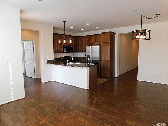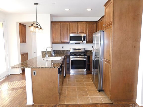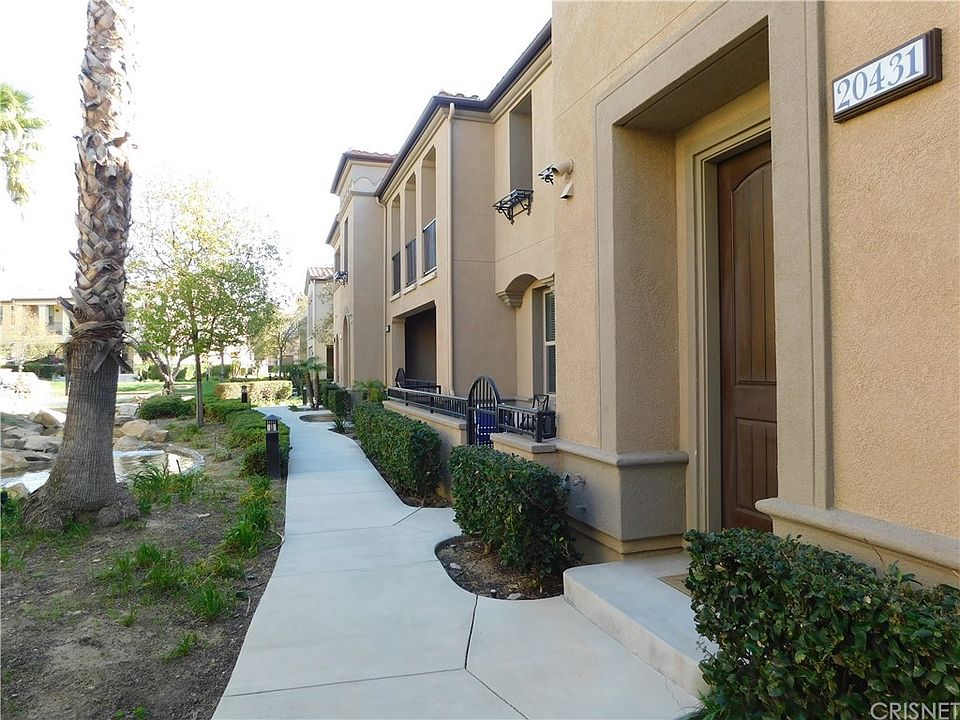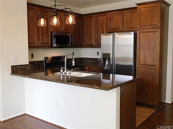 Luxurious move in ready, light & bright two-level Porter Ranch town-home in desirable private, guard gated Las Brisas at Aldea. Amenities of this must see freshly painted home built in 2010 situated in a superior location of the community w/views of the community waterfall, includes a designer-selected entry door, 2 bedrooms, 2 full bath, beautiful wood flooring throughout, gourmet kitchen w/granite counter tops w/full back-splash, stainless steel appliances, including Showcase Samsung refrigerator, brand new Samsung microwave, dishwasher, Samsung Stainless Steel convection oven, & trash compactor, Nest thermostat & new modern light fixtures, spacious family room features a new stylish ceiling fan, & Milgard windows, dining room features a new modern chandelier, w/a good size balcony off the kitchen. Large master bedroom also w/a new modern ceiling fan features a sumptuous private bath, dual sinks w/granite counter tops, & dual mirror large walk in closet.The second bedroom also good-sized features a large closet & a new modern ceiling fan w/a view of the community waterfall & is located adjacent to the secondary full bathroom.2 car tandem direct access garage, & side by side laundry room w/washer & dryer included! Convenient to the San Fernando Valley freeway system, featuring a wide range of facilities, Including the new entertainment hub of the valley "The Vineyards", Porter Ranch Town Center, Porter Valley Country Club, YMCA, CSUN and the Porter Ranch Community School K-8