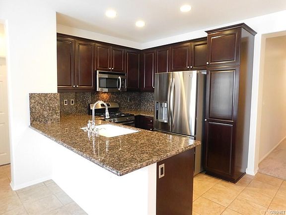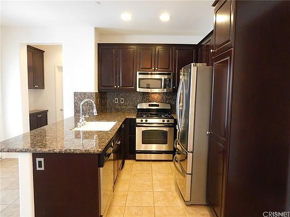 Luxurious move in ready, light & bright two level Porter Ranch town-home in desirable private, guard gated Las Brisas at Aldea. Amenities of this must see home built in 2010, include a designer-selected entry door, 2 bedrooms, 2 full bath, gourmet kitchen with granite counter tops with full back-splash, stainless steel appliances, including dishwasher, range/oven, microwave, & trash compactor, the spacious family room features a stylish ceiling fan, and Milgard windows, dining room with chandelier, with a good size balcony off the kitchen, beautiful tile and new carpet flooring. Large master bedroom with sumptuous private bath, dual sinks with granite counter tops, and dual mirror large walk in closet. The second bedroom also good sized features a large closet, and full bath. Two car tandem direct access garage, and side by side laundry room. Convenient to the San Fernando Valley major freeway system, featuring a wide range of recreation facilities, Including the new entertainment hub of the valley "The Vineyards", Porter Ranch Town Center, Porter Valley Country Club, YMCA, CSUN and the Porter Ranch Community School K-8!