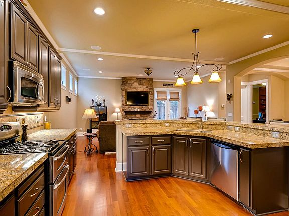 Abundant upgrades & custom finishes! Gleaming hwoods & extra high ceilings thru-out main lvl. Desirable greatrm concept feat chefs kitch w/granite, custom tile backsplash, box ceilings, large eat area. Spacious liv rm w/sound sys, cozy FP & french doors. Formal dining w/elegant archways. Master retreat w/romantic FP & spa-like ba. Main lvl exec office. Huge bonus. Prvt backyard w/patio, lvl lawn. Quiet neighborhood, exceptional schools!