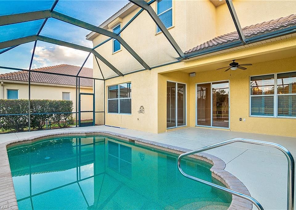 Spacious 5-BR home with heated pool and lake view in Bella Terra. Tile and LVP flooring throughout the home except upstairs bedrooms. The home is thoughtfully equipped with accordion and electric shutters upstairs for effortless storm protection. One guest bedroom downstairs, perfect for guests or an office. Additional features of this remarkable property include a two-car garage, a large laundry room, and wired music system. 2 new ACs with UV light system and pool heater replaced 2 years ago. Located in Bella Terra, residents of this gated community enjoy a wide range of amenities, including resort style pool, fitness center, clubhouse, basketball, tennis, pickle ball, soccer field, playground and more! You are only a short drive to food shopping, retail stores, restaurants, Hertz Arena, and RSW airport.