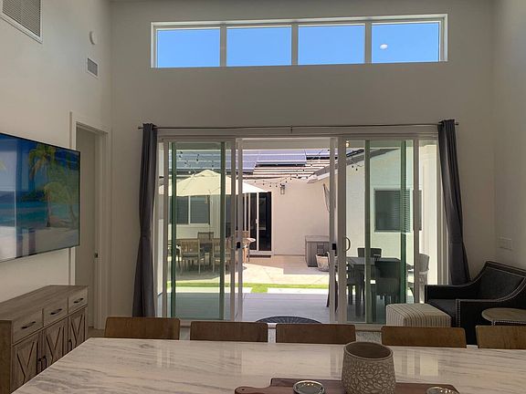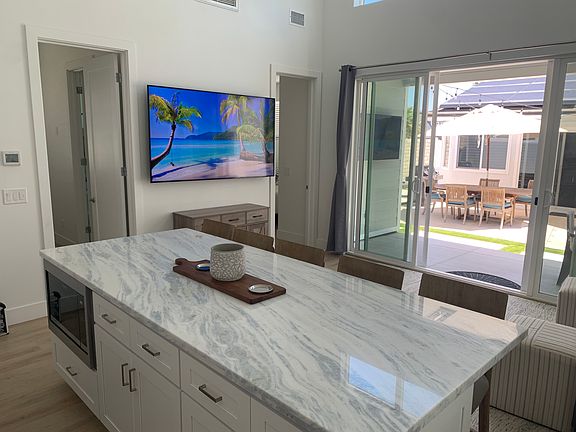Queen bedResidential neighborhoodCal king bedComfortable seatingOutdoor smart tvHigh ceilings and windowsSun loungers