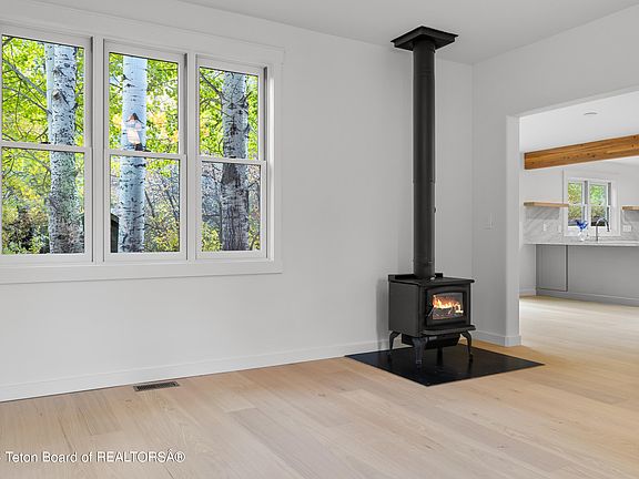 Located minutes from town, Hidden Ranch Subdivision offers a convenient location close to town with private access to pathways and proximity to Flat Creek, shopping, and schools. This two-story home was professionally remodeled creating a thoughtful new 4-bedroom layout with high ceilings, abundant light, and new white oak flooring throughout. The first floor has a spacious living room with a wood-burning stove and windows that look towards a mature stand of Aspen trees in the backyard. The dining room opens into the new gourmet kitchen equipped with custom kitchen cabinetry, quartz countertops, Fisher Paykel appliances, new plumbing, and lighting fixtures. The second floor has a spacious primary bedroom with a barndoor that opens into the ensuite bathroom with double vanities, a walk-
