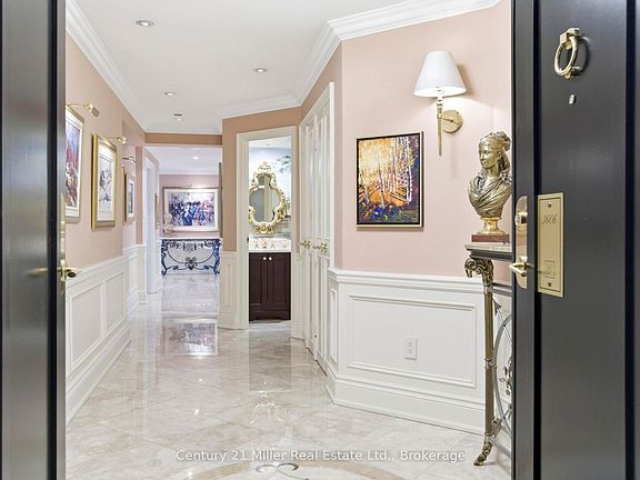 Spacious 3,247 sq. ft residence on the 36th floor of the Luxurious Resort-Style Palace Pier showcasing breathtaking lake and city skyline views. Elegant wainscoting enhances the lobby and corridors, complemented by marble and porcelain flooring throughout. The open-concept kitchen features a marble peninsula, statement marble wall, and backsplash overlooking the breakfast area and family room with built-in wall unit. The great room offers a dining area, built-in bar, solarium with julitette balcony, custom electric fireplace, and automated blinds on the floor to ceiling windows. Lots of natural light and beautiful view of Lake Ontario! The primary suite includes two large walk-in closets, solarium with juilette balcony, luxurious 5-piece bath, and pop-up TV. A truly exceptional home with refined custom finishes.Two bedrooms were converted to a custom office/library with built-ins and fireplace which can be easily converted back to two bedrooms. Amenities include: Fitness and aerobics center, Restaurant, Club on 47th floor, media room ,ar, event kitchen stage for events, terraces, tennis court, putting green, squash courts, golf simulator Table tennis room billiards room Party Room, convenience store, spa, arts and crafts room, childrens playroom , 24 hour concierge, 18 hour valet service, hourly bus service to downtown 6 days a week, 7 guest suites, large indoor swimming pool with whirlpool and sauna, pets allowed with restrictions