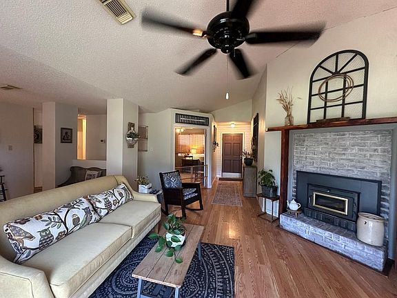 Charming farmhouse on 3 peaceful acres! This 1,485 sq. ft., 3 bed, 2 bath home was built in 1990 and has been beautifully updated. Inside you'll find new wood plank flooring throughout (except laundry), fresh paint in the kitchen, living, and primary bedroom, plus cedar accents on the fireplace mantel, bathroom baseboards, and mirror trim. The living room features a wood stove with electric blower, while the spacious kitchen includes a pantry, dishwasher, stove, refrigerator, and all window treatments convey. The primary suite offers a walk-in closet, private bath, and sliding glass door leading to a covered deck. Updates include a new roof in 2023 and spray attic insulation in 2022. The home is all electric with central heat/air, a private well, vinyl siding, and sits on pier & beam. Outside, enjoy a fenced backyard, 6 ft. privacy fence on one side, extra wood fencing that conveys, plus a storage building with loft. Peaceful, updated, and move-in ready!