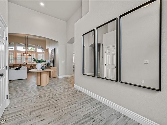 Fabulous home in Anthem Heights offering over 3,000 sq. ft. of living space on a .24-acre lot with a deluxe pool and spa. The vaulted entry opens to a bright living and dining area with large windows overlooking the backyard. The chef’s kitchen features custom white cabinetry, quartz countertops, subway tile backsplash, oversized island with breakfast bar, pendant lighting, and stainless steel appliances including built-in double ovens and microwave. The family room showcases a slate stone fireplace and custom finishes including new tile flooring throughout. The spacious primary suite has direct access to the backyard. A newly remodeled primary bath has a spa like feel with a walk-in shower, dual vanities with makeup counter, and a large walk-in closet with custom organizers. Secondary bedrooms have convenient bathroom access. The backyard is designed for entertaining with a covered patio, built-in BBQ, pool with slide and spa, expansive side yard, and peek-a-boo Strip views.