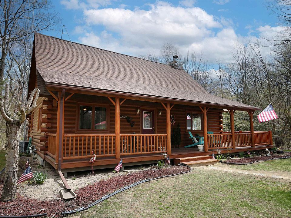 Classic Country on County Line! Nature's tranquility will surround your ora when you turn on to your private drive. Just off the paved path sits this 1600 square foot Russell log cabin on 23.15 acres that includes the most relaxing view of the Little Salt Rivers Salt Creek. Enjoy the wrap around deck for all your grilling and relaxing needs. Let's continue inside and bask in the sunlight that the wonderful south facing wall of windows brings into your home. With an open beam concept the main living space consists of your kitchen, featuring maple cabinetry and granite countertops, a wood fireplace in the living room, and an amazing space for your dining table. On the main floor you will find the master bedroom with its own bathroom suite and first floor laundry area. Head up to the loft area where you can look over the home and have a private office or toy space if needed. Another bedroom and full bath is on the second floor as well! Don't be disappointed in your lower level, a massive great room with a bar area, sliding door to the fishing area or simply open the door and just listen to the water pass by. The third bedroom and another full bath is available for all your guests. The home offers a 30x48 Pole barn with 2 standard doors and a large side door for a camper or boat. New roof in 2019, furnace in 2022, 80 foot wifi tower and also boasts a 22k whole house generator. Centrally located between Midland and Mt Pleasant, you do not want to let this opportunity pass you by. Call today for a private showing!