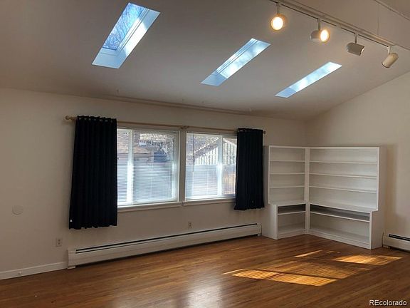 This is a spacious mid century ranch home with 4 bedroom 3 bath that has 1,578 square feet on the main floor plus 828 square feet basement of which 745 square feet is finished. Hardwood floors throughout the main floor, vaulted ceilings in the living room, kitchen and dining room with lots of window area. Skylights in the living room and master closet and bath. The kitchen has been updated with natural wood cabinets with brushed silver hardware, tiled counter top and backsplash, white appliances and hanging pan racks. Unit includes washer and dryer, evaporative cooler, window coverings, ceiling fans, built in shelves, refrigerator, dishwasher, double oven range, microwave. Open floor plan with main floor master bedroom. Security storm doors on front and rear entrance. Bus stop outside your door, walk to Observatory Park, light rail, post office, near by restaurants and shopping. Minutes from Denver University, Welshire Golf Course, Colorado Blvd. Retail and the I-25 corridor.