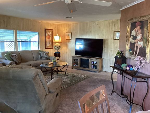 Charming Two-Bedroom, Two-Bath Double-Wide Mobile Home in Highly Sought-After Dunnellon Square Nestled in the serene and desirable 55+ community of Dunnellon Square, this immaculate double-wide mobile home offers comfort, style, and convenience. Surrounded by lush landscaping, the property boasts an inviting front open patio that leads to a lovely enclosed porch with glass windows and window shades, perfect for enjoying the outdoors year-round. The home features a spacious, oversized living room bathed in natural light, complemented by plush carpeting that extends into the dining area. The dining area is highlighted by a charming chandelier and a built-in china cabinet with drawers and enclosed glass cupboards, perfect for displaying your favorite knick-knacks. The kitchen is a cook's dream, with plenty of cabinet space, new black appliances, and a recently updated paint job. Beautiful hardwood flooring runs throughout the kitchen and hallway, and additional counter space can be found in the additional countertop area, along with a stainless steel sink. Storage space is abundant, making this a truly functional kitchen. The guest bedroom is generously sized with a mirrored double closet and a ceiling fan, providing ample space for your guests. The guest bathroom has been recently updated with modern finishes, including updated wall treatment, a fresh toilet, sink, and mirror. The master bedroom is an expansive retreat, offering enough space for a king-size bed, dressers, and even a desk. A massive walk-in closet provides plenty of room for your wardrobe, with an extra closet for additional storage. The attached master bath features elegant tile flooring, ample cabinet storage, and a brand-new mirror, making it a perfect space to unwind. This home also comes with an attached shed that includes a front-load washer and dryer, plus additional shelving for storage. The lot rent is just $595, and the community offers a rec room, pool, and pet-friendly amenities. Storage options are also available within this gated, well-maintained community, which features a clubhouse for residents to enjoy. With its impeccable condition and numerous updates, this home is truly a must-see! Call us today to schedule a showing and discover everything this charming home and community have to offer.