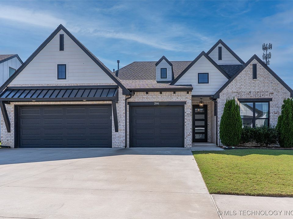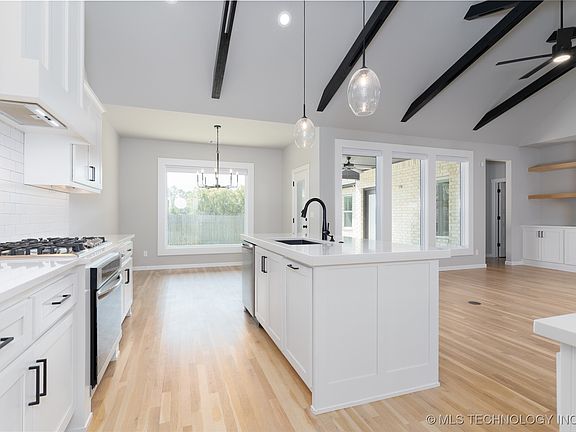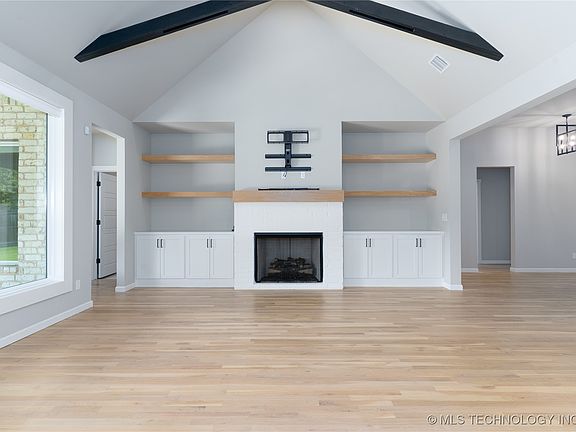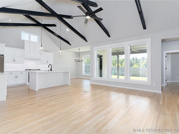 This stunning newer construction home at 2046 E 140th St in Bixby features vaulted beamed ceilings and abundant windows that fill the space with
