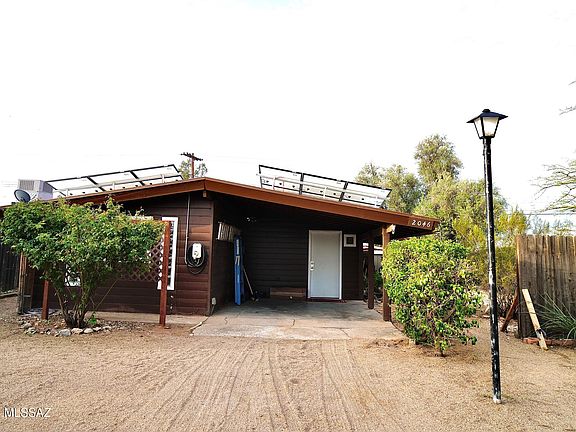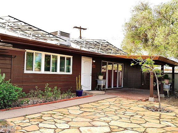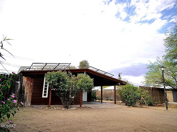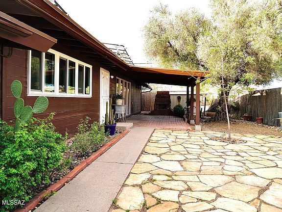 A charming mid-century bungalow blending vintage appeal with smart, modern upgrades on a lush 7,840 sqft lot enveloped in mature vegetation and a gravel driveway. For ultimate privacy, the home greets you with flagstone and a mature olive tree with landscaping accents and a covered patio featuring a cozy wood-burning fireplace--perfect for year-round outdoor gatherings. Inside, newly installed high-end Italian wood-look tile sweeps through the 1,496 sqft space, vaulted ceilings and custom woodwork that adds timeless character.The updated kitchen is a standout, equipped with new stainless-steel appliances including a dishwasher, refrigerator, gas cooktop, and oven, ready for meal prep and entertaining. Four bedrooms provide ample room for family or guests, while bonus spaces like a freestanding shed and an insulated 5' x 11' storage room off the single-car carport offer endless possibilities for hobbies, a home office, or even future expansion.