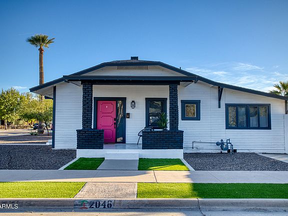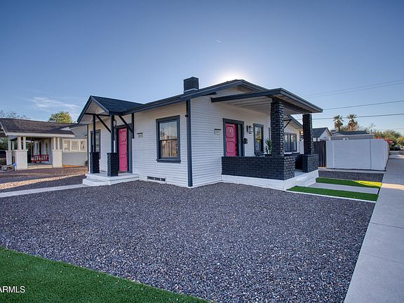 Check out this trendy home on a large corner lot in the centrally located Historic Coronado Neighborhood. The main house is 1112 sq ft 2bed 2 bath, pool house/studio 581 sq ft. This beautiful home has been completely remodeled to include the detached pool house equipped with 12 ft slider, bathroom, murphy bed, full size refrigerator, & cabinets. Main house kitchen has been updated with quartz countertops, white cafe' appliances, white shaker cabinets, large under-mount black sink, and under & over cabinet lighting. Primary bedroom is stunning, with accent walls, electric fireplace and custom lighting. Walk-in closet includes washer/dryer & linen cabinet. All bathrooms include tiled walk-in showers, tiled floors and gold accents. The backyard is an entertainers delight with new pebble tech heated party pool with 2 Baja shelves, bench & table. Built in gas BBQ & Firepit. Above ground hot tub, artificial turf and travertine. Other upgrades include, new electrical panel, sub-panel and wiring, underground plumbing to the street completely replaced, both roofs replaced in 2021, tankless water heaters, HVAC's replaced in 2017 & 2022, both showers in the main house just completely re-done 12/2024. Too much to list on this one!! This home can be sold turn-key and is perfect for someone looking for a ready to go Airbnb. You cannot beat the location, 7 minutes from the airport and a short 20 minute walk to Downtown Phoenix!!