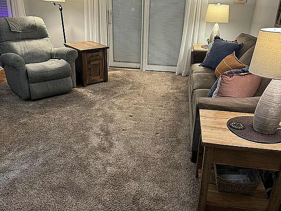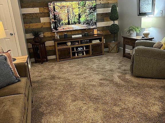 • Living Room – Features a custom wood accent wall, plantation blinds, and Pella sliding doors leading to your private deck.