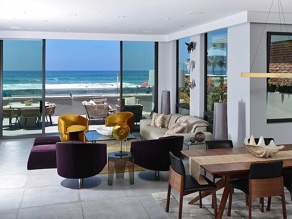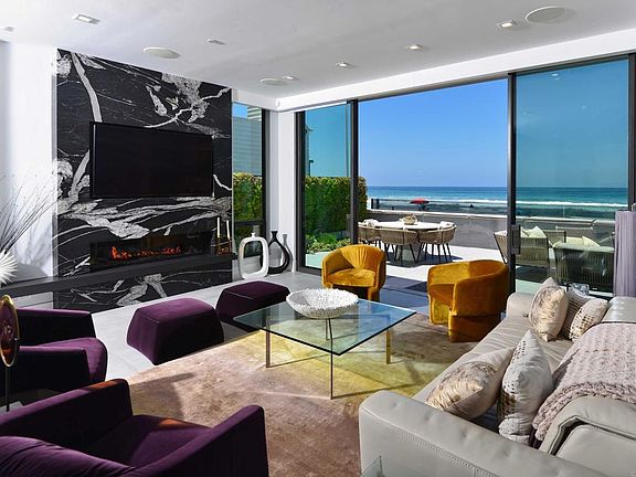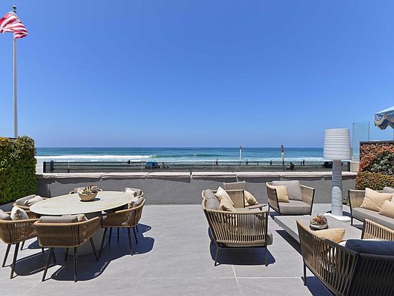 Awe-inspiring contemporary beach house on the sand in Del Mar. Completed in 2019, this sophisticated 3 bedroom beauty incorporates the highest quality finishes and brilliantly designed outdoor living spaces. The oceanfront patio and balcony, plus interior BBQ wet bar, and the massive rooftop living/dining room add over 1,300sqft of highly coveted open-air livable square footage at the beach. Interior details include a honed marble kitchen island, White oak flooring, dramatic floating staircase, custom motorized shades, fireplace with floor-to-ceiling marble surround, and so much more. An open concept design, with high volume ceilings and oversized glass windows and doors, accentuates the sparkling whitewater ocean views.