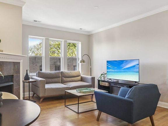 Bright and spacious corner unit with an outstanding private deck-truly the best tier in the building. This end unit features rare four-sided exposure and a modern, open floorplan. Fully reconstructed in 2004 down to the brick, it offers the experience of a 20-year-old home, with all-new electrical, plumbing, windows, insulation, and drywall from the time of conversion. The home has been meticulously maintained, with a forced air heat and central air conditioning system replaced in 2019, and all appliances recently updated and upgraded. Perfect for entertaining, the oversized kitchen features a peninsula breakfast countertop that opens to the living and dining rooms, ideal for both work-from-home scenarios and everyday use. Windows on all sides provide abundant natural light. A centerpiece fireplace warms the all-hardwood room, with the warmth of the hardwood flooring carried throughout each room in the home. The expansive deck is one of the best you'll find in Chicago, with West and North exposure that makes it perfect for anytime enjoyment or entertaining. Overlooking well-kept neighboring yards, the deck adds privacy and functions as an additional room to the home. Both bedrooms are generously sized with large closets, and there is additional closet space throughout the unit. The primary bedroom, accessed through elegant French doors, enjoys beautiful Southern exposure sunlight that brightens the entire home. The association is well-maintained and pet-friendly. Situated on an ultra-wide residential street, ideal for walkers, and just an 8-minute walk to scenic Potawatomi Park. The Metra at Lunt is only a 16-minute walk away, with the Howard Red and Purple Lines, and Jarvis Red Line within similar walking distance. Multiple buses in all directions are steps away, adding convenience to this Far North Side location with immediate access to Evanston, nearby beaches, and Touhy's commercial mini-district just two blocks away. Three blocks to Howard Street and its variety of restaurants, shops, and services, with Western Avenue a few blocks beyond. The proactive, mostly owner-occupied association has strong reserves, making this a truly wonderful home on a beautiful residential street.