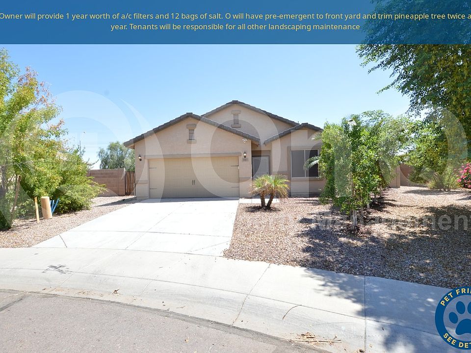 ** Owner will provide 1 year worth of a/c filters and 12 bags of salt. O will have pre-emergent to front yard and trim pineapple tree twice a year. Tenants will be responsible for all other landscaping maintenance ** Save with this Energy-Efficient Home Featuring Installed Solar & Shade Screens! This 3 bedroom, 2 bath, 1,552 sq. ft. single-story home in Maricopa's desirable Homestead community offers a newly remodeled interior with fresh paint, upgraded wood-like flooring, and plush carpet in all the right places. Designed for comfort and convenience, the home includes shade screens, wood blinds, and ceiling fans throughout. The open-concept layout features a charming eat-in kitchen with an expansive breakfast bar, new stainless appliancesincluding a side-by-side refrigerator, dishwasher, and microwaveand flows seamlessly into a spacious living and dining area, perfect for entertaining. The primary suite boasts a walk-in closet and full bath, while two additional bedrooms provide plenty of space for guests, or a home office. Outside, enjoy an oversized backyard with a covered patio and storage shed, ideal gatherings. Added upgrades include an installed RO system, water softener, and a security system with cameras ready for tenant activation. The home also offers a two-car garage, pest control services included, and the benefits of solar energy for lower utility costs. Homestead is a beautifully maintained community with a scenic lake, playgrounds, and walking and biking trailsmaking this home the perfect blend of comfort, efficiency, and lifestyle. 1 year worth of a/c filters and 12 bags of salt will be provided the first year. Pre-emergent for the front yard and trimming of pineapple tree twice a year is included. Tenants will be responsible for all other landscaping maintenance. Minimum credit score of 600 required. Pet Policy: Dogs Allowed with the following exceptions: Up to 2 dog MAX will be considered upon approval! No cats or birds APPLICATION: $65 Application Fee Per Applicant 18 years or older (Nonrefundable). Please allow 24 to 72 business hours to process the Application once all required documents are submitted by all applicants. Move-in dates beyond 21 days from the Application Approval will require special approval. LEASE LENGTH: 12-month Minimum (Longer Lease Term may be negotiable) INITIAL MOVE-IN COSTS: Upon application approval, a nonrefundable Holding Retainer will be required to secure the property and will be applied towards the move-in costs. The Holding Retainer amount is determined by the type of Security Deposit option you choose. Applicants can choose between a traditional Security Deposit which may be 1.25 times the monthly rent but not greater than 1.5 times the monthly rent (75% refundable) or a Security Deposit Alternative program (only available on long-term leases of 12 months or more). A $250 one-time lease preparation fee as well as the first month's rent is due prior to move-in. If the Applicant has a Pet, $150 Non-Refundable Pet Fee per pet. RECURRING MONTHLY COSTS: There is a 3.3% Administration Fee. If the Applicant has a Pet, a $35 Pet Rent Per Pet (Does Not Apply to Assistive Animals). All On Q Property Management Residents are enrolled in the Resident Benefits Package for $39 or $49 with pets, which includes liability insurance, credit building to help boost the resident's credit score with timely rent payments, move-in concierge service making utility connection and home service setup a breeze during your move-in, Renter to Buyer program, and much more! *Other terms and conditions may apply. The list price is the base rent and recurring monthly costs may apply. All information including advertised rent and other charges are deemed reliable but not guaranteed and is subject to change. ATTENTION: This property has an approved applicant pending receipt of their holding deposit. We are actively accepting backup applications, as the property will remain available to qualified applicants until the holding deposit is secured. By submitting your information on this page you consent to being contacted by the Property Manager and RentEngine via SMS, phone, or email.