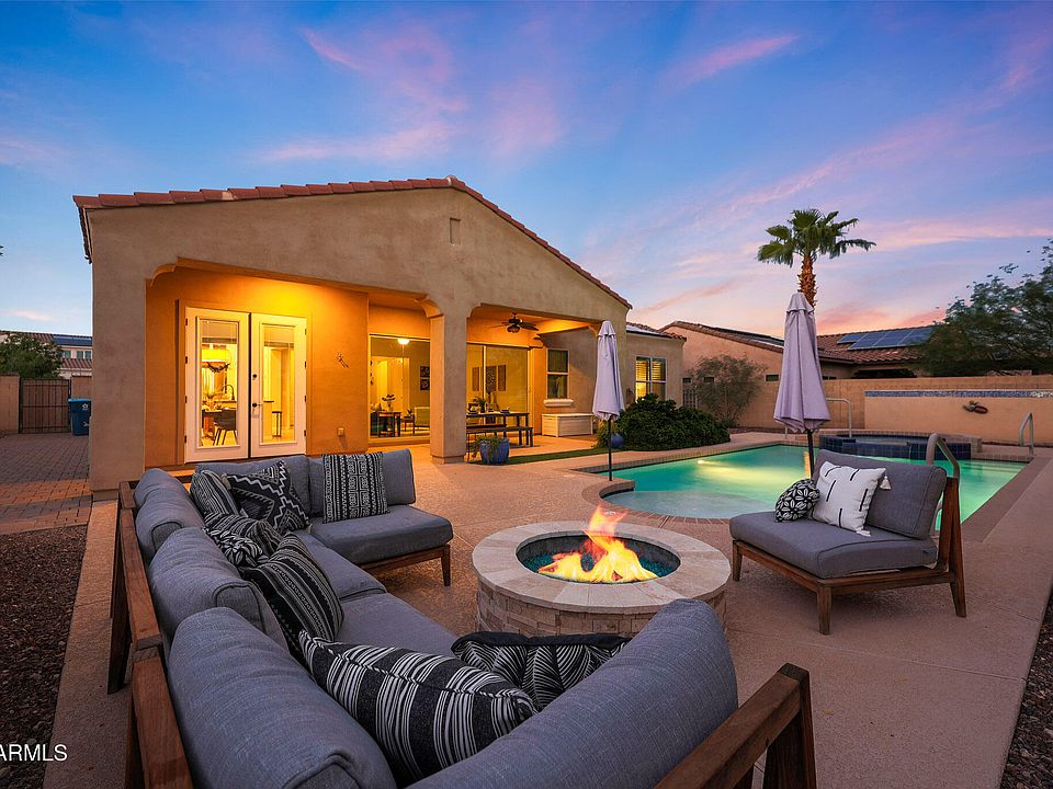 Experience everyday living in this beautiful 4-bedroom, 2-bath retreat designed for comfort, beauty, and community. Boasting mountain views and located near the neighborhood park, this home features a spacious great room with breathtaking views of the sparkling pool through a 16' multi-slider door—perfect for gatherings. The great room flows seamlessly into a bright kitchen with upgraded French doors, granite countertops, a large island, and top-of-the-line stainless steel appliances, with thoughtful details including staggered wood cabinetry, crown molding, and a reverse osmosis system for fresh, clean water. Natural light fills the home through plantation shutters, highlighting the warm Arizona sunshine. The primary suite offers a private retreat with a beautifully tiled, expansive... shower and a custom walk-in closet. Outside, the backyard is a true paradise, featuring a heated pool, private spa, covered patio with FireMaster BBQ, and desert landscaping on an oversized lot for privacy and beauty. As smart as it is stunning, the home includes owned solar, a soft water system, an EV charging station, and energy-efficient Meritage construction with foam insulation, UV-tinted windows, and 2x6 framing. Verrado is an award-winning community where neighbors become friends. Enjoy tree-lined streets, 78+ parks, hiking and biking trails, two community pools, a fitness center, and year-round events that make life feel like a celebration. With new shopping, dining, and a medical campus coming soon, convenience is only growing. More than a place to live, this is a place to belong. Don't miss your chance to make Verrado home!