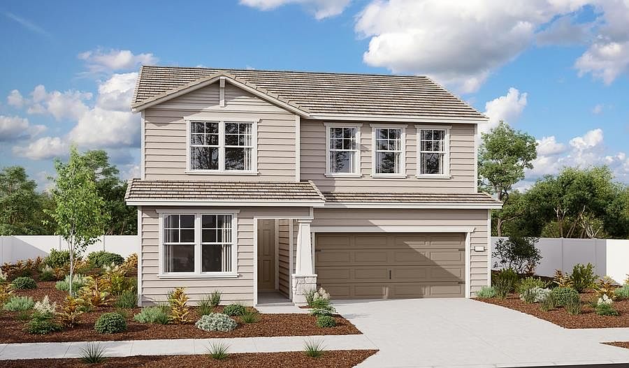 Two story model home home features covered patio, dining and great room, downstairs bedroom, three upstairs bedrooms with loft, and upgraded flooring, countertops, and stainless steel kitchen appliances. Includes solar panels, refrigerator, washer and dryer, and fully landscaped rear yard.