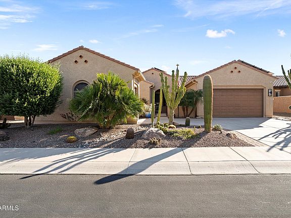 Golf Course Jubilee & Owned Solar! Front Paver Courtyard. Tile & Plank Flooring Throughout, NO CARPET! Family Room w\Media Wall, Fireplace, Power Blinds & Surround Sound. Large Eat In Kitchen has Granite Counters, Island, Pull Out Shelves, Soft Close Cabs & R.O. system. Owners Suite w\French Doors to the Updated Master Bath w\Quartz Counters & Large Modern Walk-In Tiled Shower. Guest Bedroom with adjacent full bath provides privacy for guests. A custom wall has been added to the Den, unlike the standard floor plan. The Laundry has 16 cabinets & a Sink. Garage has Epoxy Floors, Cabinets, Water Softener & is plumbed for a sink. 3rd Car Garage also has Epoxy Floors. Great Fenced Backyard w\Ext Paver Patio, Pergola, Large Water Feature Pond, TV, and great Golf & Sunrise views! Must see!!