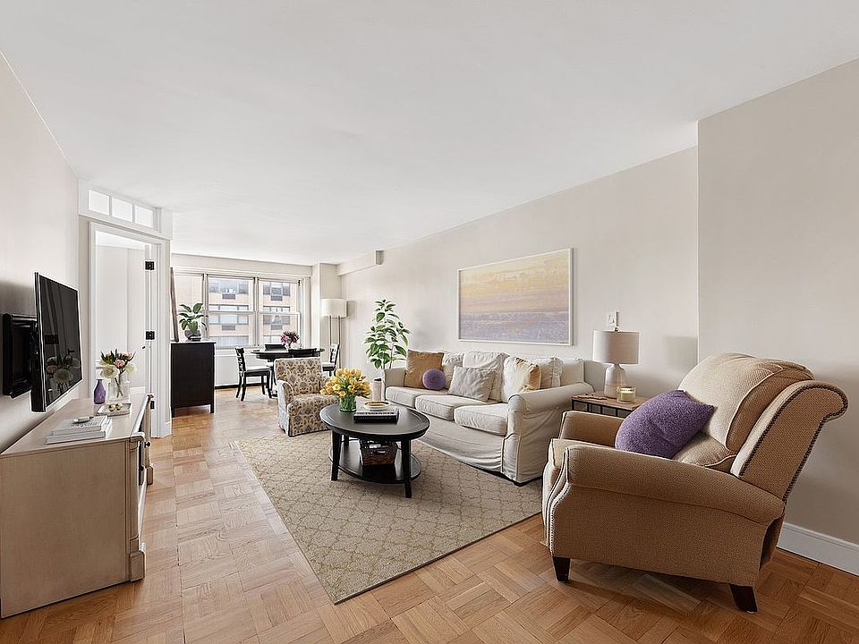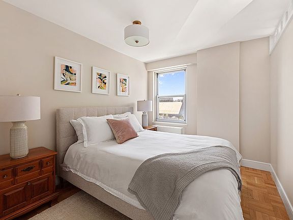 Spacious, Sunny Junior 1 with a South facing living/dining area is adorned with hardwood floors throughout. It has a renovated galley kitchen with a quartz countertop and custom cabinetry. The bedroom is also south facing and it leads to a dressing area with room for a vanity or dresser and two ample closets that lead into the newly renovated bath. The bath has attractive ceramic tiles and a Carrara marble vanity. Upon entering the gracious entryway, you are greeted by two large custom closets.