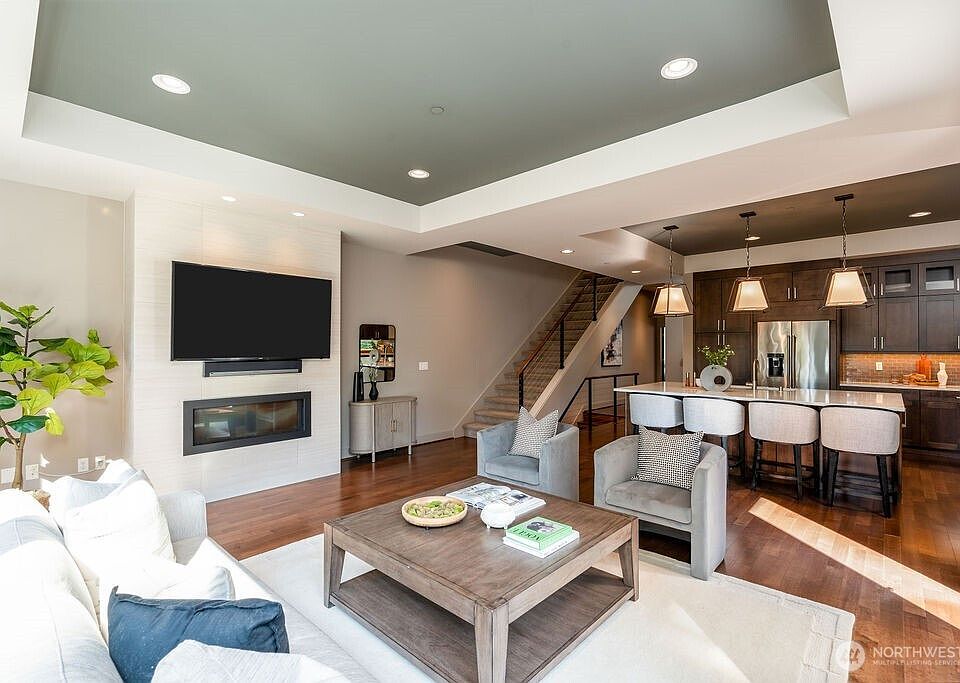 Sophisticated & inviting, this 5BD/4BA end-unit home offers contemporary finishes, open living, & premier location. Sunlight pours through oversized windows, highlighting the expansive layout & sleek designer details. The gourmet kitchen with oversized island, double ovens, & wine fridge anchors the main level & flows to bright dining & living spaces with floor-to-ceiling windows. The primary suite features a spa-inspired bath & private balcony, while additional bedrooms, baths on every level, & a versatile lower-level bonus room provide comfort & flexibility. Outdoors, enjoy a fully fenced yard. A spacious 2 car garage completes this meticulously cared-for one-owner home, moments from Lake Washington, parks, dining, & downtown Kirkland.